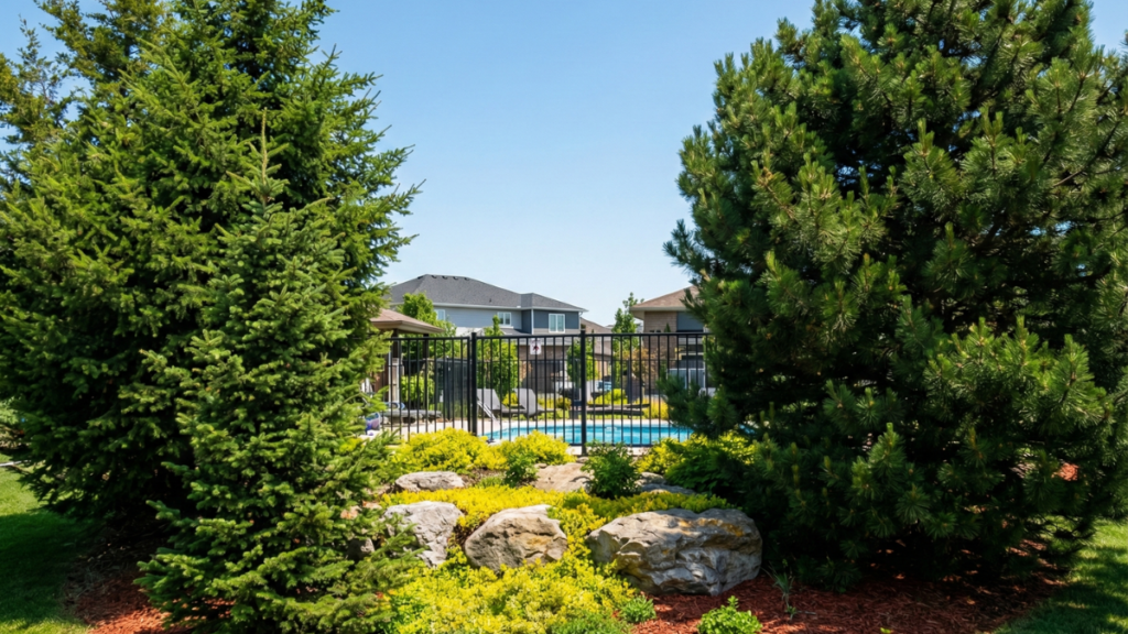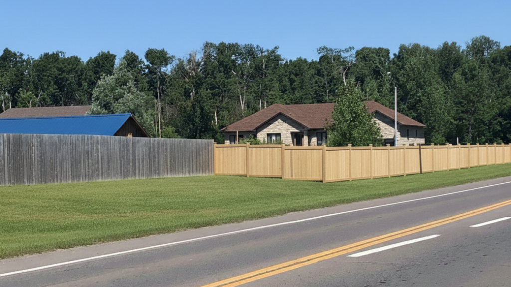 Non-Compliant Installation: The black chain-link fence shown here is prohibited as it lacks the necessary natural screening required to integrate the structure into the property’s landscape.