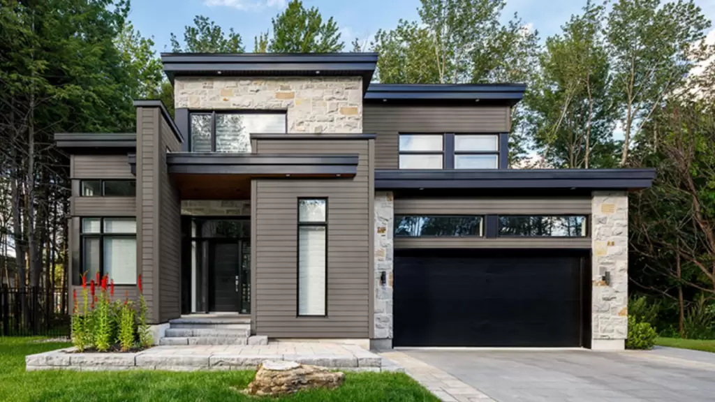 Banned Material Example: Although the facade uses authorized stone, the structure remains unapproved due to the installation of vinyl siding on the sides.